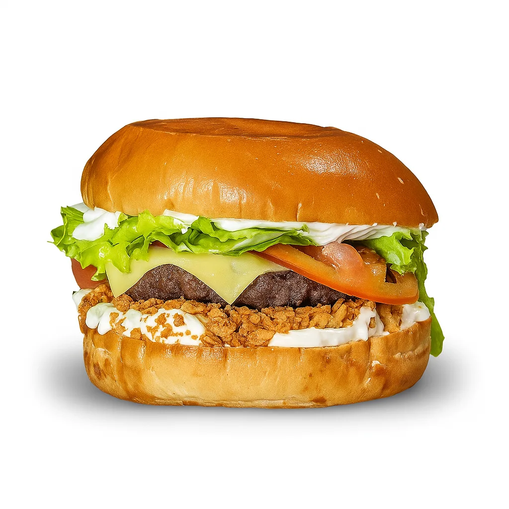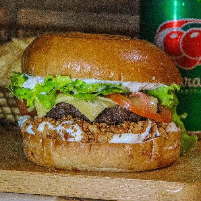 Pão brioche, 1 blend bovino de 120g, cream cheese, cebola crispy, alface, tomate, maionese exclusiva.