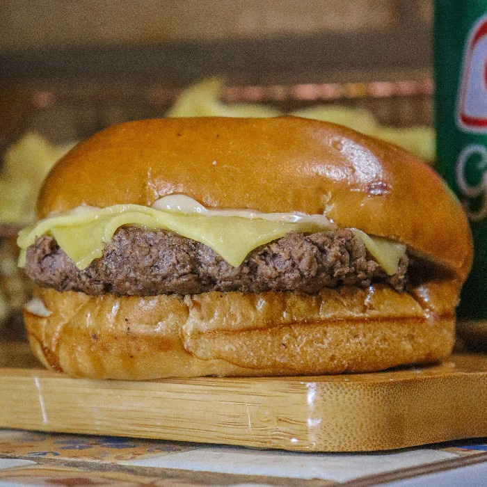 Pão brioche. 1 blend bovino de 100g. queijo muçarela. maionese defumada.
