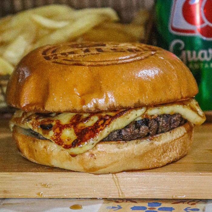 Pão brioche, 1 blend bovino de 120g, queijo coalho, molho barbecue, mel gourmet, maionese exclusiva.