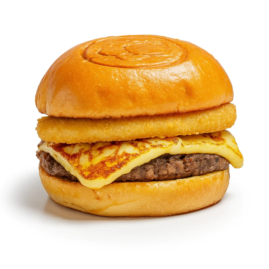 Pão brioche selado, 1 blend bovino de 120g, anéis de cebola crocantes, bacon, cheddar premium, queijo muçarela, molho Artesão exclusivo.