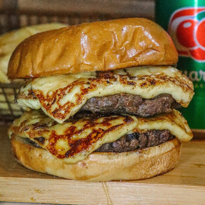 Pão brioche, 2 burgers blend de 120g cada, 2 queijos coalho, molho defumado da casa.