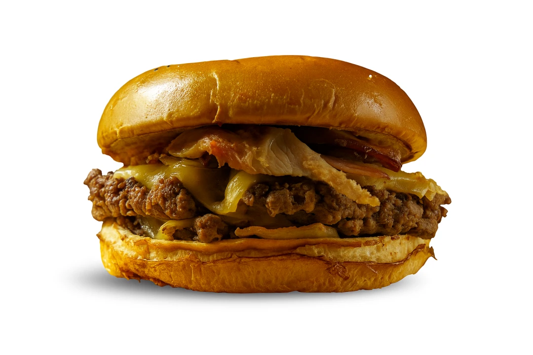 Pão brioche, 2 burgers blend de 120g cada, queijo muçarela e cheddar premium, cebola crispy, bacon, maionese artesanal exclusiva.