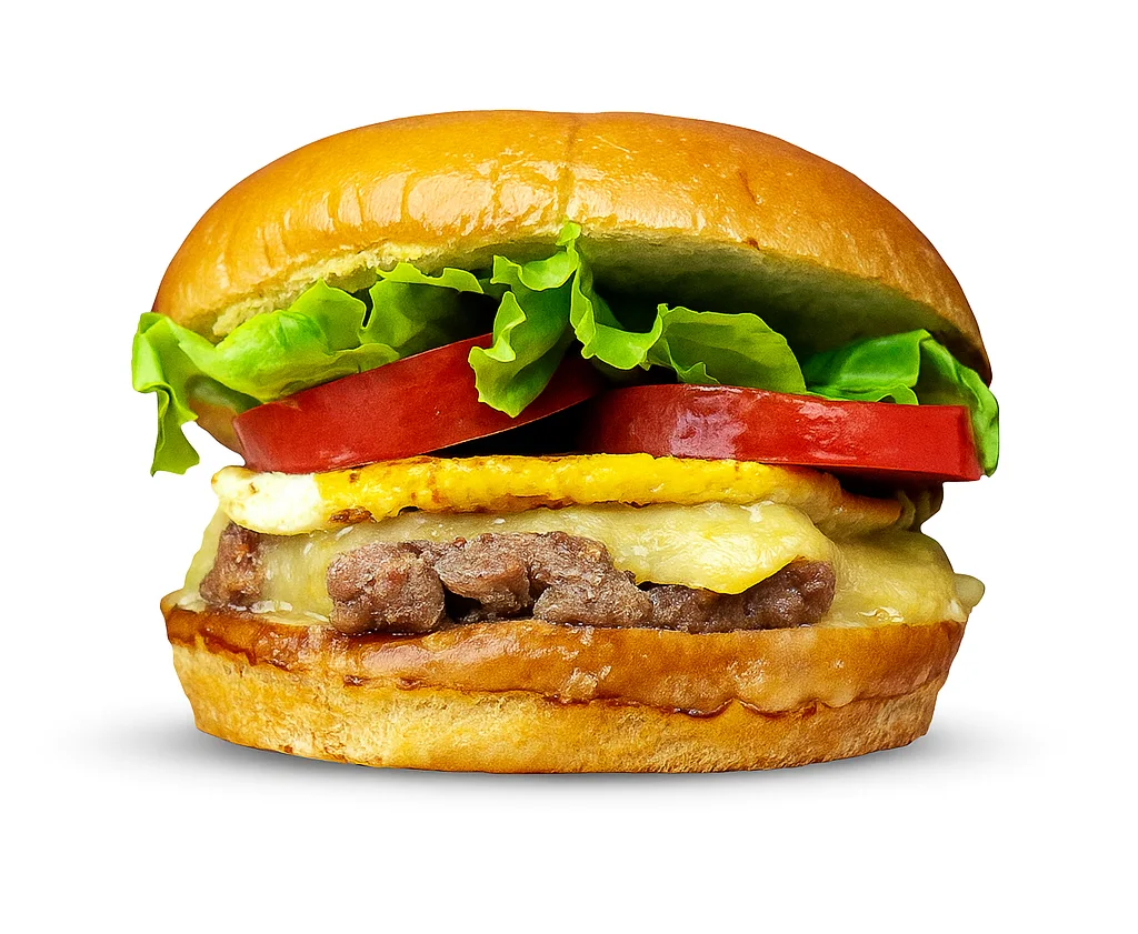 Pão brioche, 1 blend bovino de 120g, ovo, queijo mussarela, alface, tomate, maionese artesanal da casa.