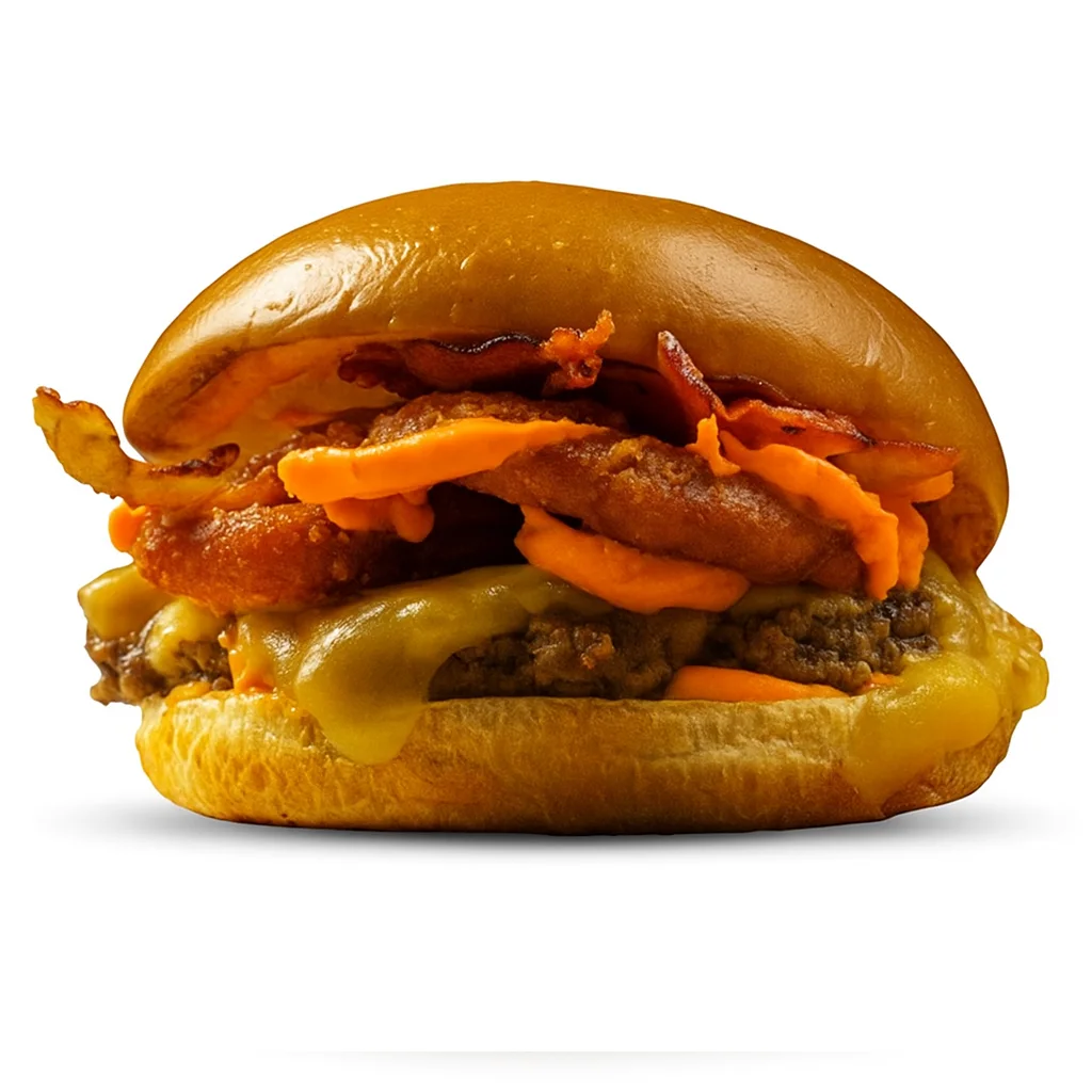 Pão brioche selado, 1 blend bovino de 120g, anéis de cebola crocantes, bacon, cheddar premium, queijo muçarela, molho Artesão exclusivo.